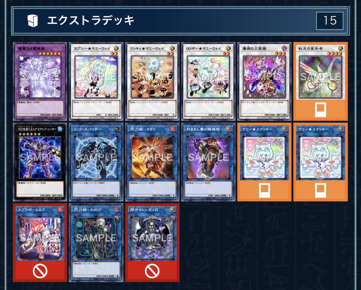 ⑩輪廻の三弦猫+下級ヤミーで「虹光の宣告者」をシンクロ召喚、左端 or 中央 or 右端に出す(今後出す「スプライトエルフ」のリンク先になるように)